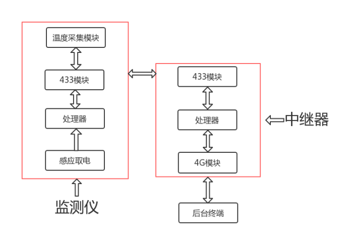 電纜頭測溫監(jiān)測儀通過自取電的方式進(jìn)行供電,節(jié)省了空間和成本,自取點(diǎn)也確保了設(shè)備的壽命不會因為供電的原因縮短,在工作期間處理器把溫度采集模塊采集到的數(shù)據(jù)通過LORA模塊發(fā)往中繼器,中繼器上的LORA模塊接受到數(shù)據(jù)后處理器利用4G模塊把測溫數(shù)據(jù)發(fā)往后臺系統(tǒng),完成一個完整的工作內(nèi)容。接地電流的采集也是同理,利用零磁通互感器采集電流,從而完成數(shù)據(jù)的上傳。